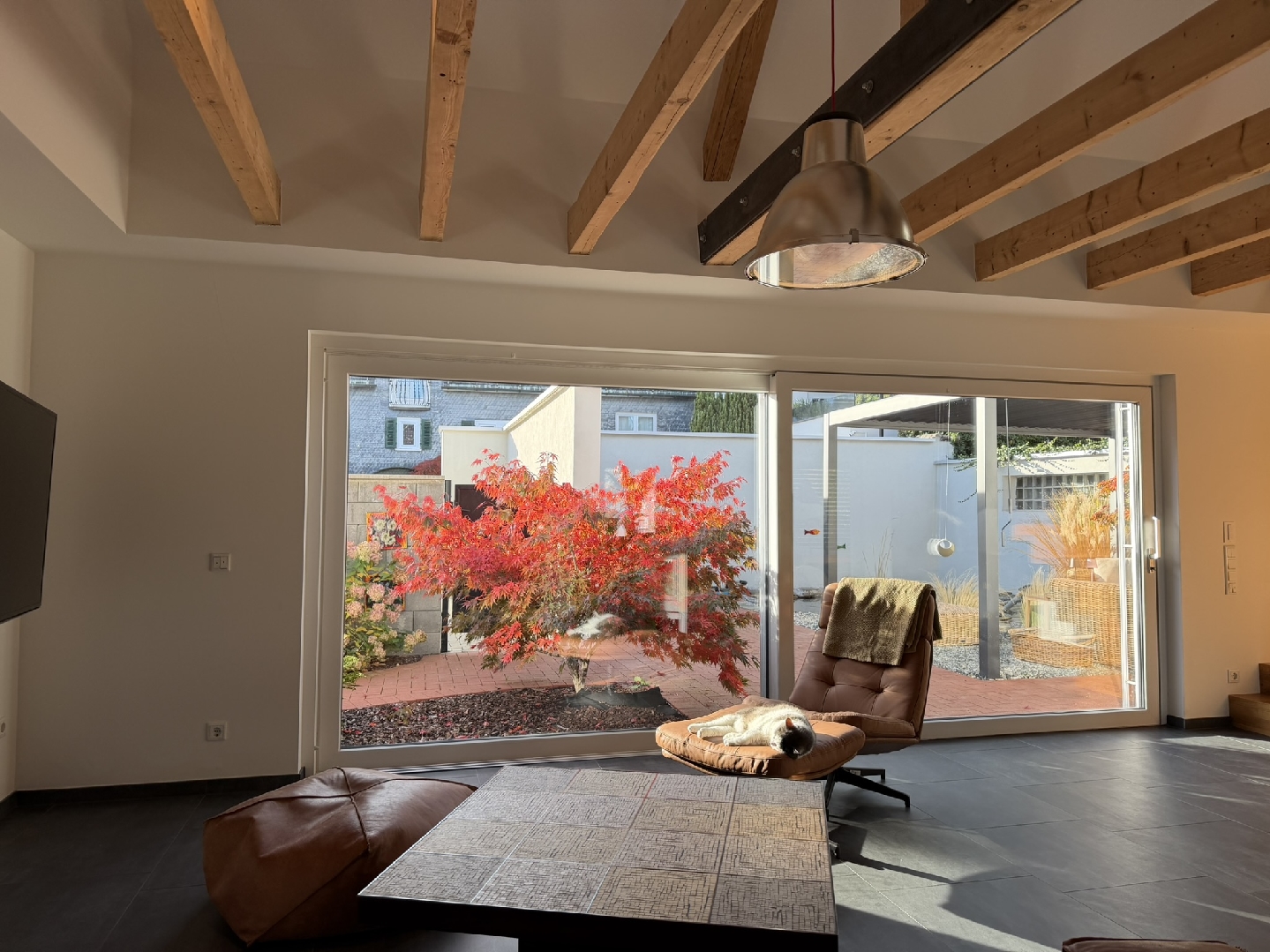 Vor dem großzügigen Schiebefenster erstreckt sich der von 3 Meter hohen Mauern umrahmte Innenhof mit Teich und einer Pergola, die Schutz vor Sonne und Regen bietet. Der Innenhof ist von dem für zwei Autos geeigneten Stellplatz vor dem Haus auch barrierefrei zu erreichen und bietet Privatsphäre durch ein abschließbares Gartentor.
