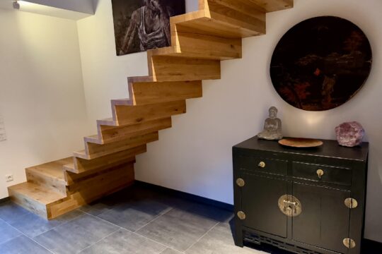 Über eine stylische Faltwerktreppe aus massivem Eichenholz gelangt man auf die Galerie unter dem offenen Dachstuhl lichtdurchflutet, ruhig, mit edlem Eichenholzboden.
